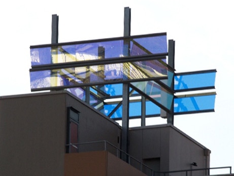 This image of a roof installation clearly depicts the transparency and high reflectivity of DICHROIC GLASS.