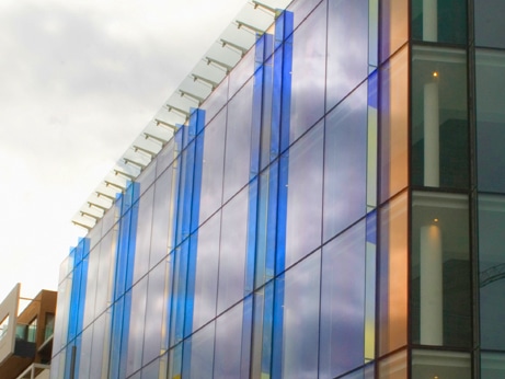 DICHROIC GLASS used in conjunction with some coated glass panels provides the opportunity for the reflective process to convey across both products.