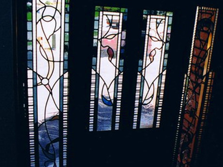 Leadlights designed for a front entranceway in a private home in Christchurch have a jubilant air full of colour hits and a feel of movement. Each window is an individual piece and yet links to its neighbour by the use of leadlines. This set of leadlight windows are signature glass designed and created by Dorothy Ratcliff.